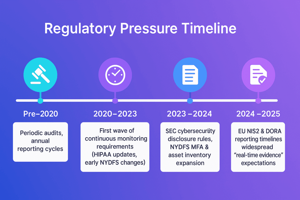Similar changes are happening in the U.S. The SEC’s cybersecurity disclosure rules give companies only four business days to report material incidents. The NYDFS Cybersecurity Regulation has added stricter requirements for asset inventories, multifactor authentication, and continuous monitoring. HIPAA guidance now focuses more on ongoing safeguards than static documentation. These expectations go far beyond what manual, periodic reviews can support.