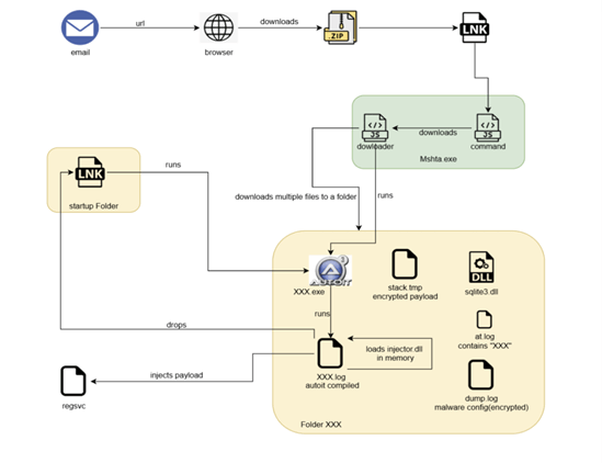 È interessante notare che secondo la spiegazione dei ricercatori il componente AutoIt non lancerebbe direttamente un file eseguibile, ma costruisce uno shellcode in memoria che recupera dinamicamente le API necessarie, carica una libreria malevola in memoria e infine la inietta nel processo di sistema affidabile “RegSvc.exe”.