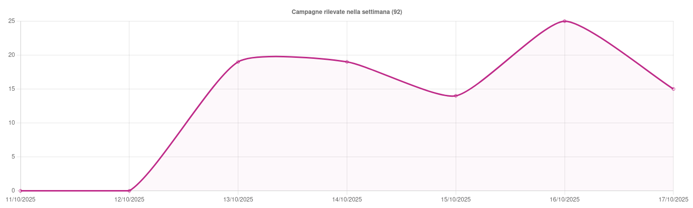 In questa settimana, il CERT-AGID ha riscontrato ed analizzato, nello scenario italiano di suo riferimento un totale di 92 campagne malevole, di cui 51 con obiettivi italiani e 41 generiche che hanno comunque interessato l’Italia, mettendo a disposizione dei suoi enti accreditati i relativi 774 indicatori di compromissione (IoC) individuati.