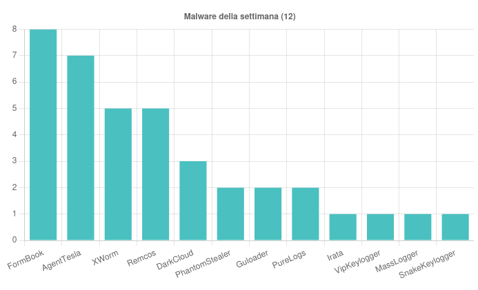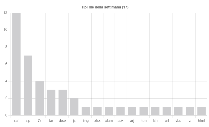 Sono state individuate, nell’arco della settimana, 12 famiglie di malware che hanno interessato l’Italia. Nello specifico, di particolare rilievo, troviamo le seguenti campagne: