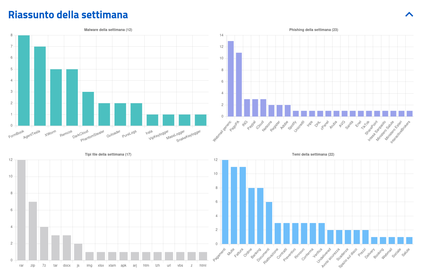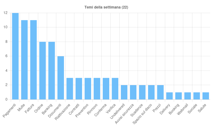 Sono 22 i temi sfruttati questa settimana per veicolare le campagne malevole sul territorio italiano. In particolare si rileva: