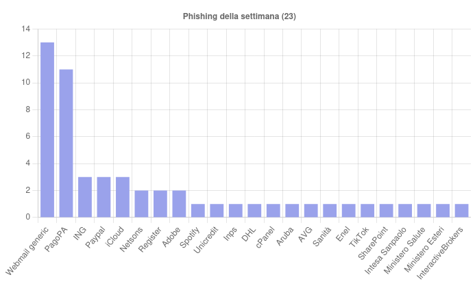 Sono 23 i brand della settimana coinvolti nelle campagne di phishing. Per quantità spiccano le campagne a tema PagoPA, ING, PayPal e iCloud oltre alle frequenti campagne di webmail non brandizzate.