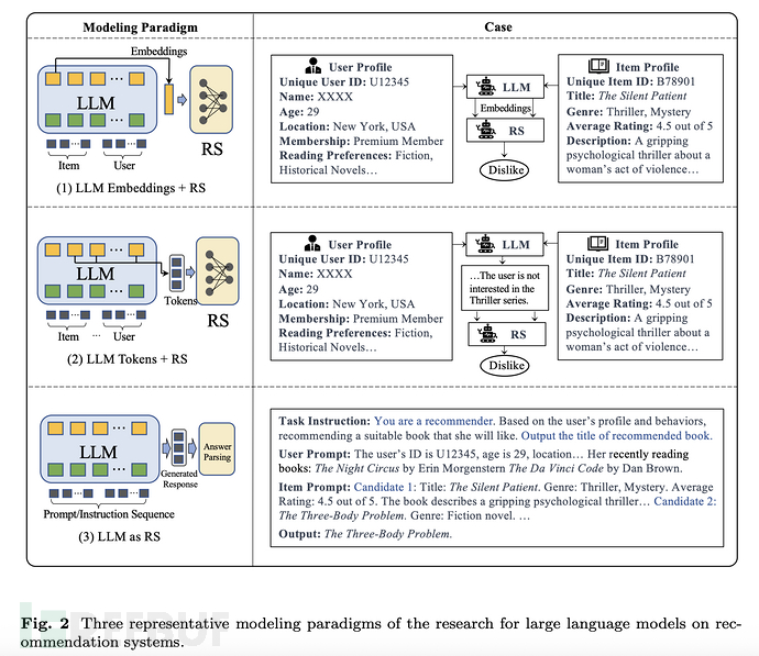 •向LLM输入用户和物品的特征,LLM生成蕴含潜在偏好信息的特定标识符(Token)。推荐系统则基于这些Token执行推荐任务。