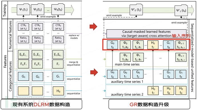 •变化1:Encoder结构输入调整为传统DLRM稀疏模型结构(含用户基础属性、偏好及行为序列等)。