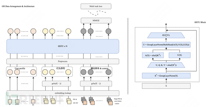 •模型架构设计:提出一种新的HSTU(Hierarchical Sequential Transduction Units,层级序贯转导单元),针对高基数、非平稳的流式推荐数据设计,通过修改注意力机制和利用推荐数据集特性,在长序列上比FlashAttention2-based Transformers快5.3x到15.2x。
