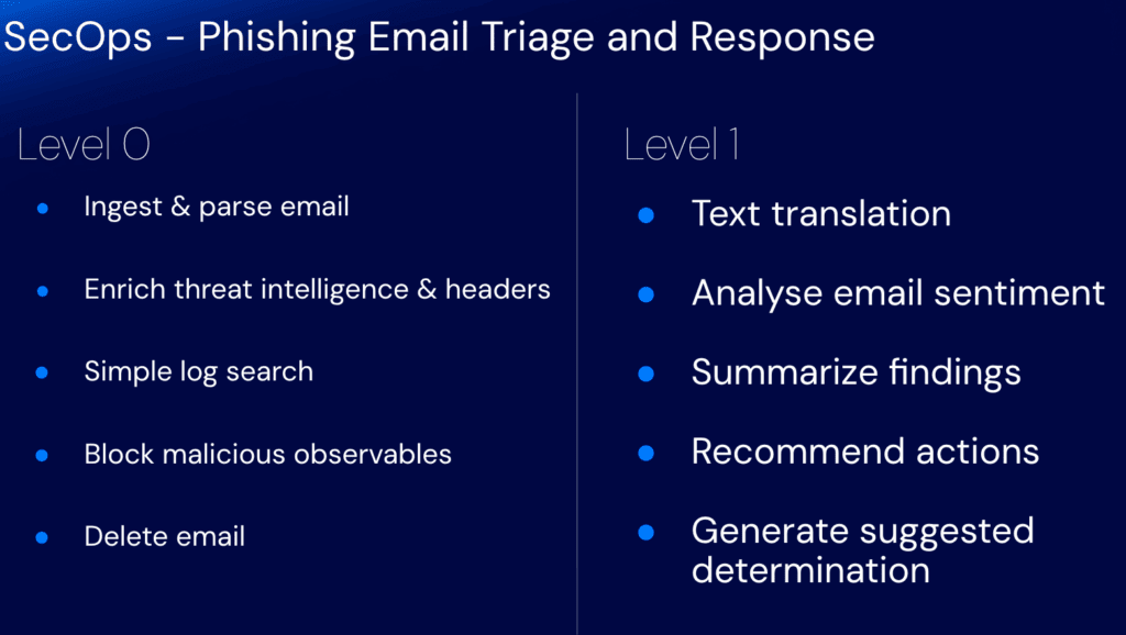 Here’s an example of what this would look like for phishing email triage and response from automated, assistive AI, supervised agentic AI, and full autonomy (level 0 – level 3).