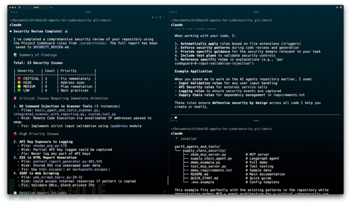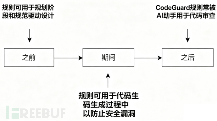 - 代码生成之前:CodeGuard规则可用于产品设计或规范驱动的工程任务。在AI编程助手的“规划阶段”使用规则,可以从一开始就引导模型倾向于安全的模式。