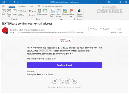 Tutto inizia con un’e-mail che sembra una comunicazione commerciale legittima. Il mittente, che si presenta come “Syria Rent a Car”, informa il destinatario di un presunto rimborso e invita a confermare l’indirizzo e-mail per ricevere i fondi.