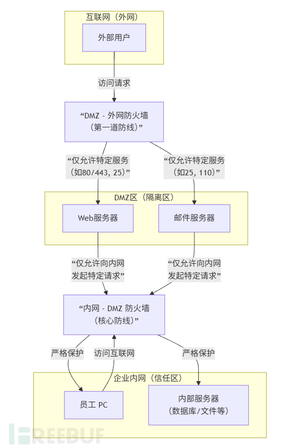 内网防火墙:作为核心防线,策略极为严格。通常完全禁止从DMZ发起的主动连接进入内网,仅允许内网用户主动向DMZ或互联网发起连接,或允许DMZ服务器向内部数据库发起特定的、被严格管控的返回连接。这形成了“内网信任DMZ,但DMZ不信任内网”的单向信任关系,极大提升了核心内网的安全性。