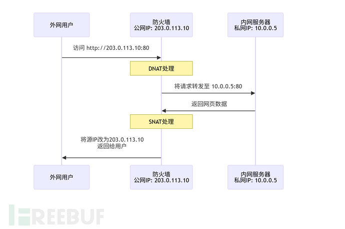 技术逻辑:通过目的地址转换(DNAT),将访问防火墙公网IP特定端口的流量,转发至内网服务器的私有IP。