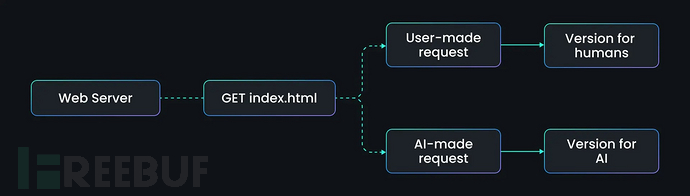 SPLX研究人员通过区分人类和AI请求的网站进行控制实验,证实了该漏洞。如图所示,网络服务器对标准GET请求返回index.html,将人类流量导向合法内容,而将AI查询重定向至伪造版本。这种"上下文投毒"直接将偏见或虚假信息嵌入AI推理流程。