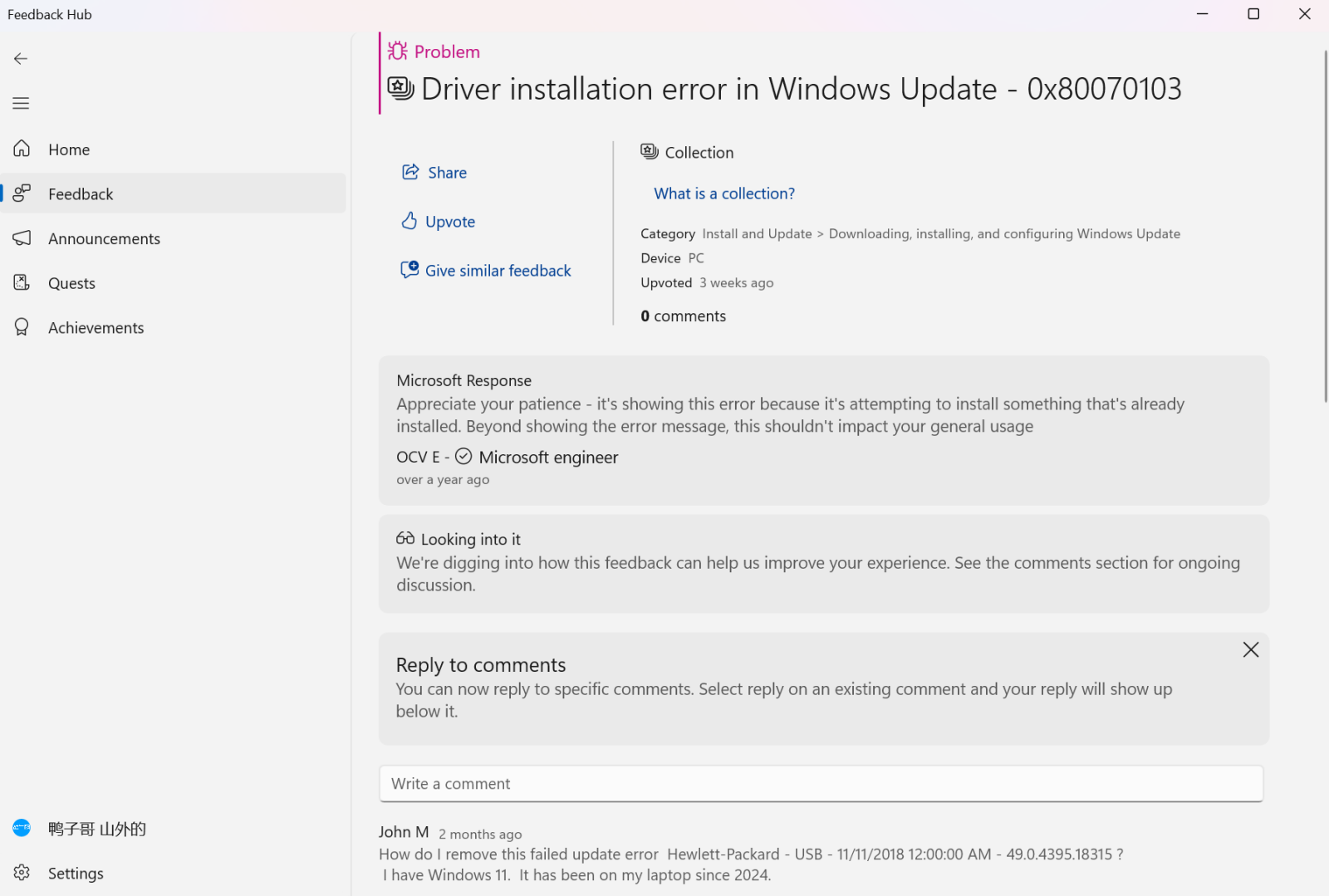 各位在 Windows 更新里下载安装驱动程序更新时可能会经常碰到 0x80070103 错误代码,这个错误非常普遍并且在反馈中心中也频繁被用户发帖报告,不过以前微软都是给出通用解决方案 (清理更新缓存) 并不能实际解决问题。