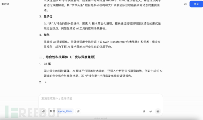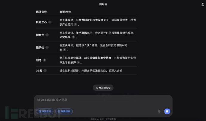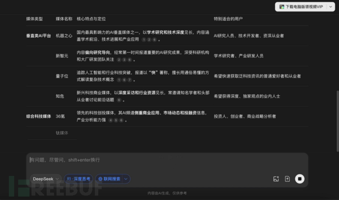 但当你去 DeepSeek 提问 “ 想了解AI可以看哪些媒体?” 并打开联网搜索和深度思考时,会得到这样的回答: