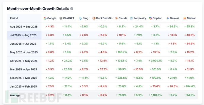 比如,Ahrefs 发布过一个结果( 如下图 ),在过去 9 个月时间内,谷歌的网站流量贡献每月平均下跌 3.2%,其他 AI 工具对网站流量的贡献则快速增长,比如除谷歌外用户量最高的 ChatGPT 每月平均增长量达到 14.1% 。