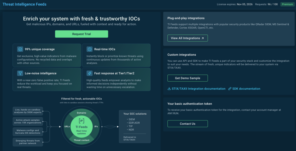 ANY.RUN’s Threat Intelligence Feeds deliver fresh, actionable indicators of compromise (IOCs) sourced directly from live attack data across 15,000 SOCs, ensuring your security infrastructure stays ahead of emerging threats.