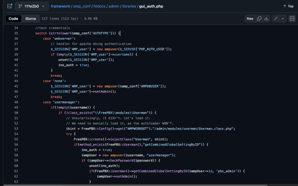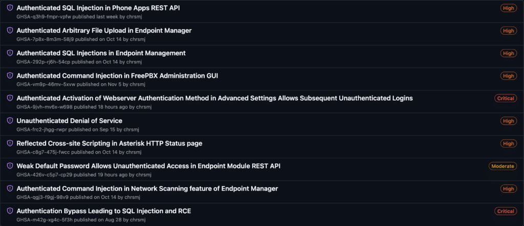 What’s interesting, however, is that during our research, what we first thought was the authentication bypass and SQL injection leading to remote code execution actually turned out to be new vulnerabilities and were unrelated to CVE-2025-57819. We disclosed these new findings to FreePBX, which resulted in three separate advisories. A list of all recent vulnerabilities for FreePBX can be found here at FreePBX’s GitHub Security Reporting.