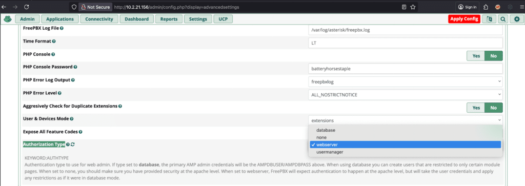 To revert to the default authentication, run: fwconsole setting AUTHTYPE usermanager If this configuration is intentional, you may continue using it. For more details, see GHSA-9jvh-mv6x-w698.Your system is using webserver authentication for the Authorization Type (Advanced Settings) option, which may offer reduced security compared to the default method.