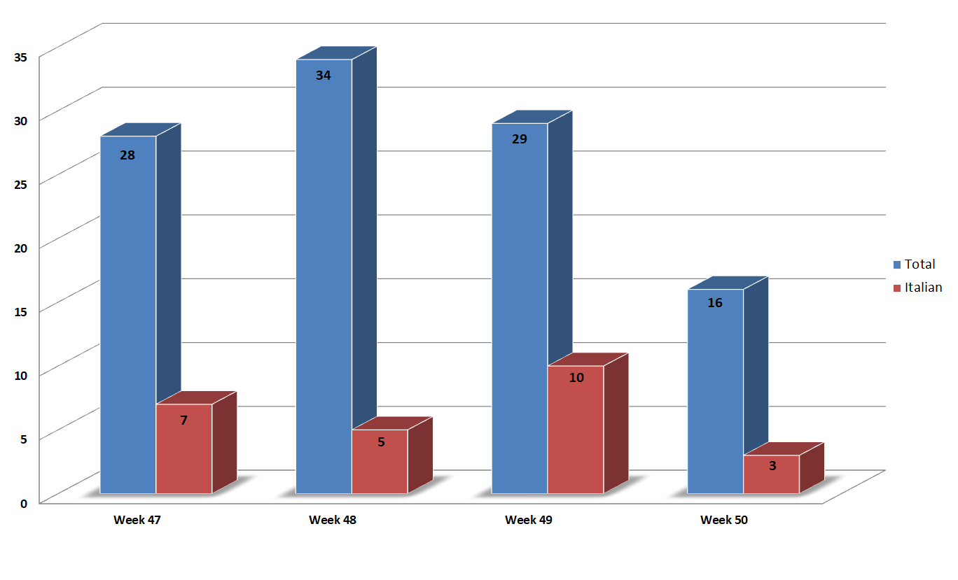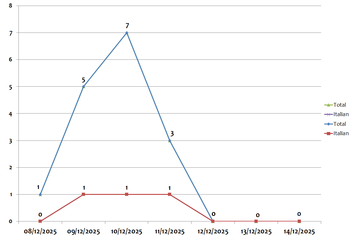 During the week, the peak of global campaigns was recorded on Wednesday, 10 December, with seven different campaigns per day. The peak of campaigns in Italian was recorded on Tuesday, 9 December, Wednesday, 10 December, and Thursday, 11 December, with one campaign per day, as shown in the graph below: