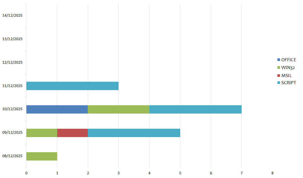 Instead in this graph we see the distribution based on malware family. In the past week 5 different families were detected: