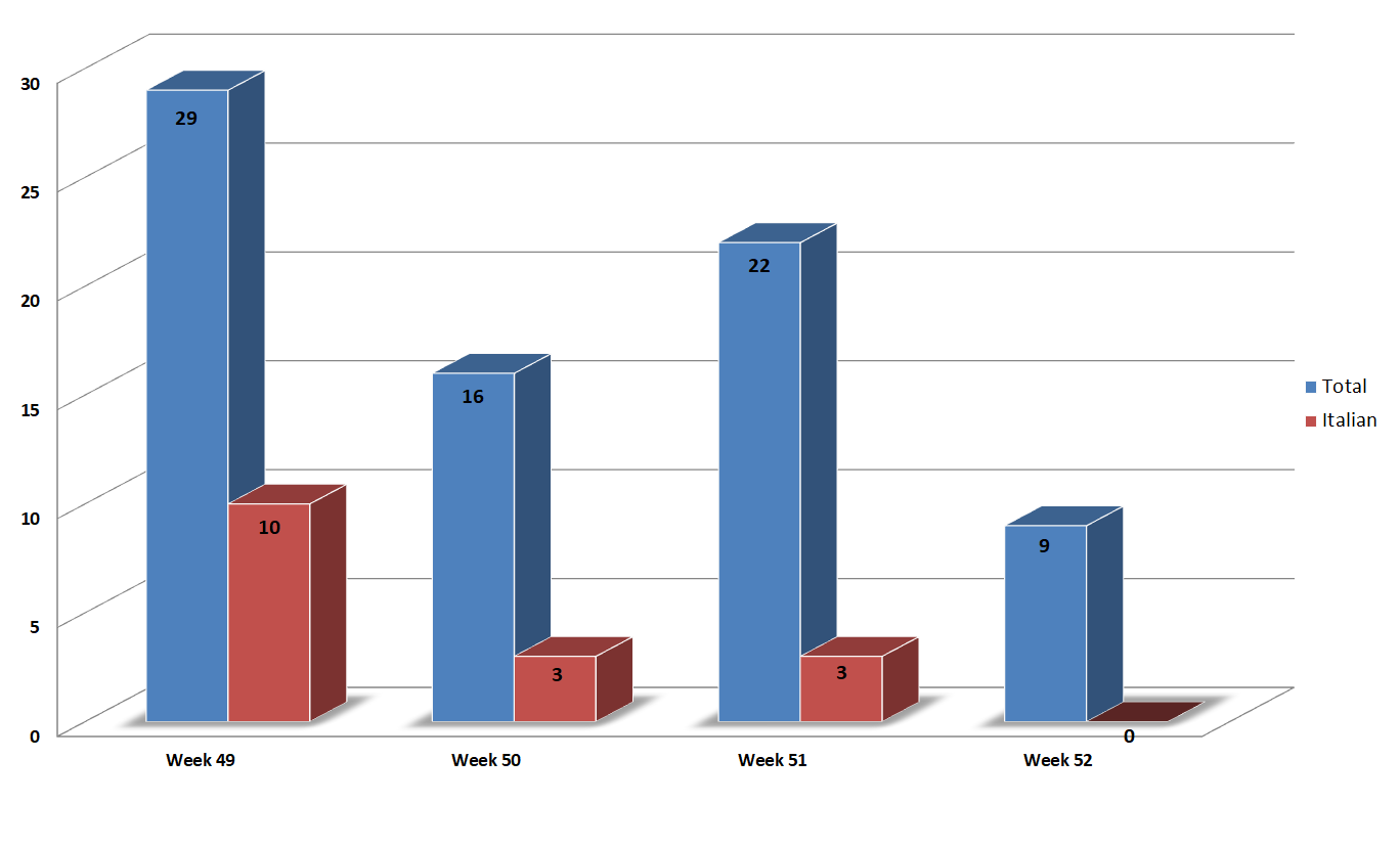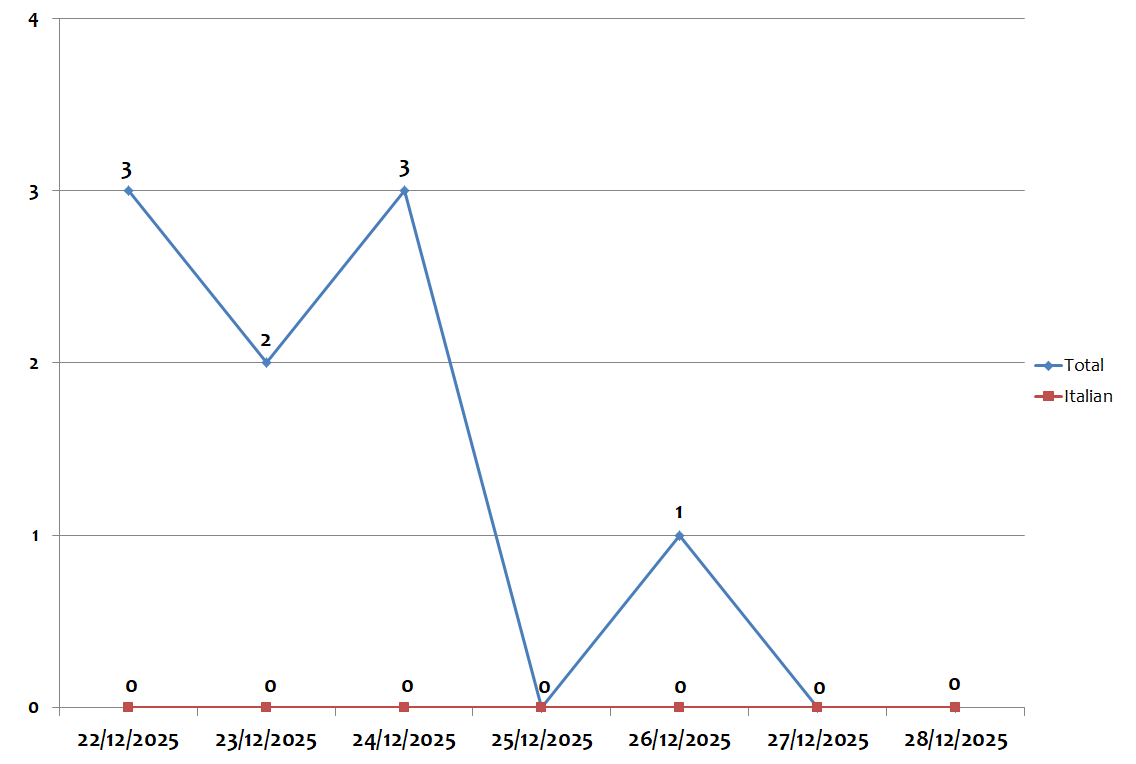 During the week, the peak of global campaigns was recorded on Monday 22 and Wednesday 24 December, with three different campaigns per day, as shown in the graph below: