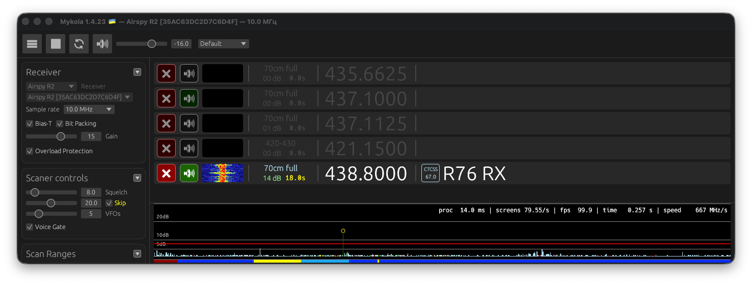 Mykola advertises extreme scanning speed abilities, adaptive noise floor, and simultaneous demodulation of 3 channels (20 in the paid pro version). It currently supports RTL-SDR, Airspy R2, and HackRF SDR devices. Some of the other features include automatic normalization of the noise floor, audio panning, and support for Windows and macOS.