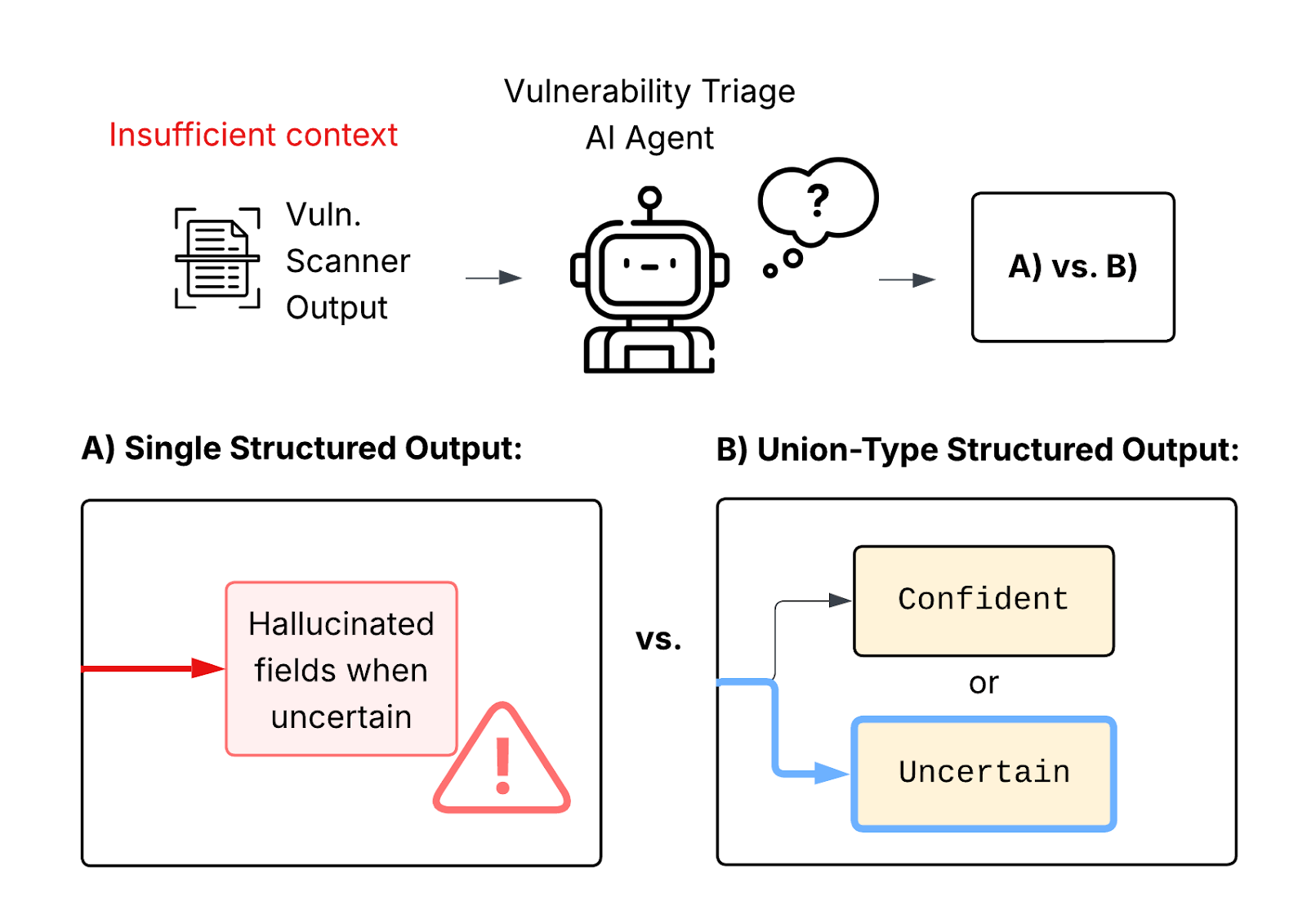 By embracing uncertain outcomes using union-type structured output, we allow AI agents to handle complex situations without resorting to hallucination. We’ve shown that simply adding an UnableToAssess path allows agents to fail safely when assessing software vulnerabilities, transforming a potential oversight into a specific request for expert review.
