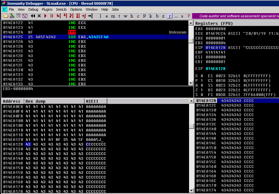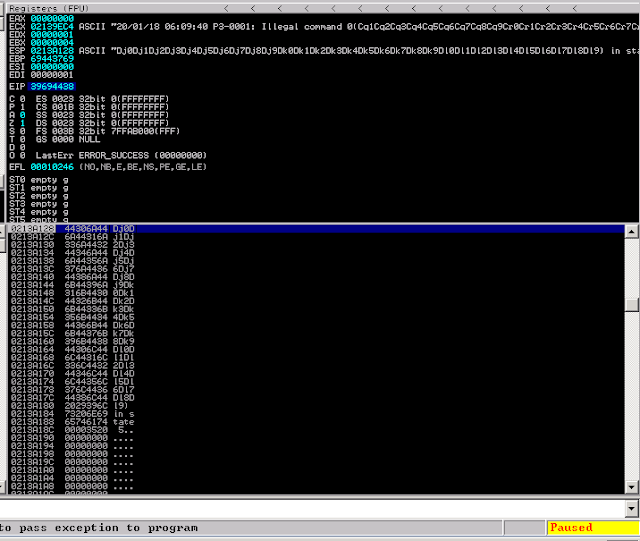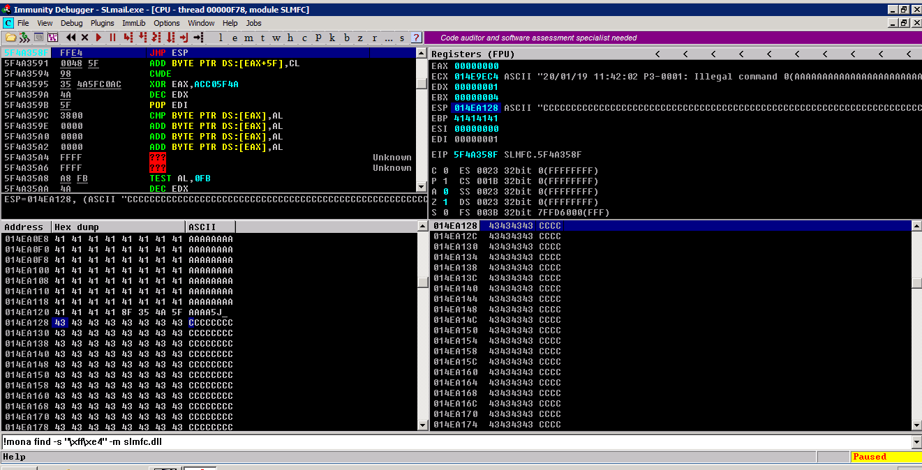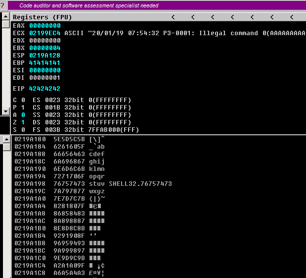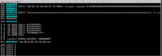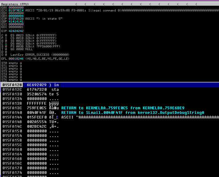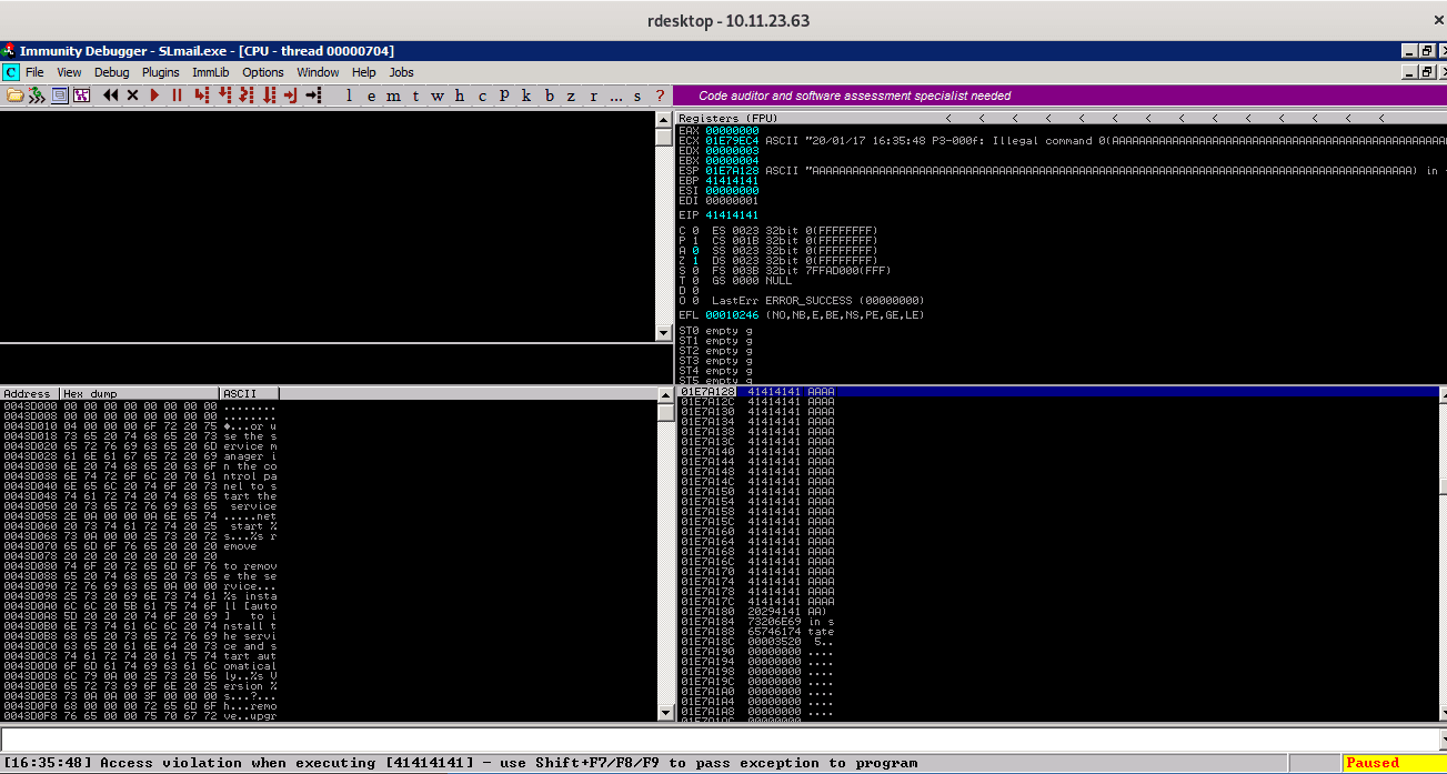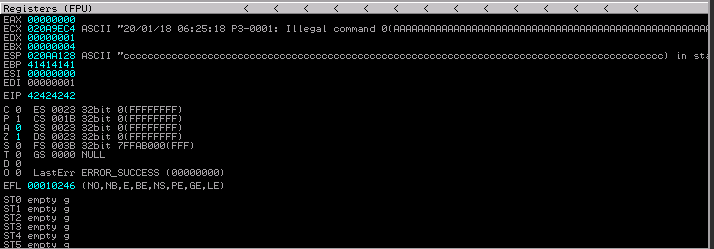 and EIP has been overwritten with “/x41” which is A and the status of the execution goes into a paused state. Which states that controlling EIP is possible in this