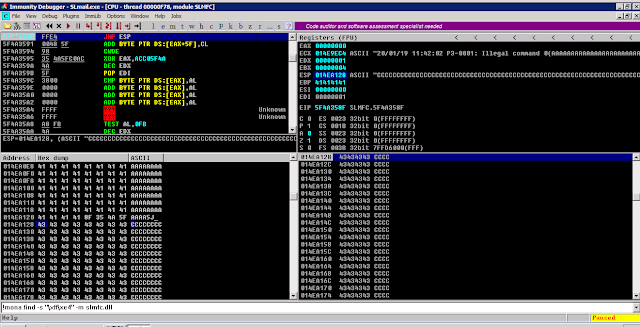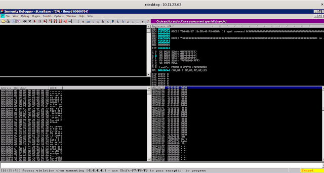 slmail crashed. In the below script a buffer of 100*A is passed to slmail PASS