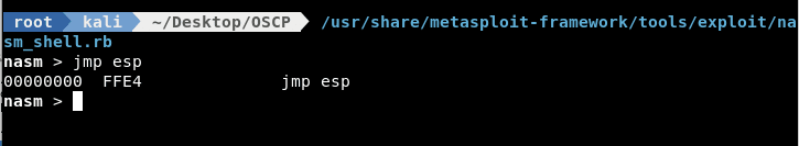 To find the JMP ESP opcode equivalent, nasm_shell.rb