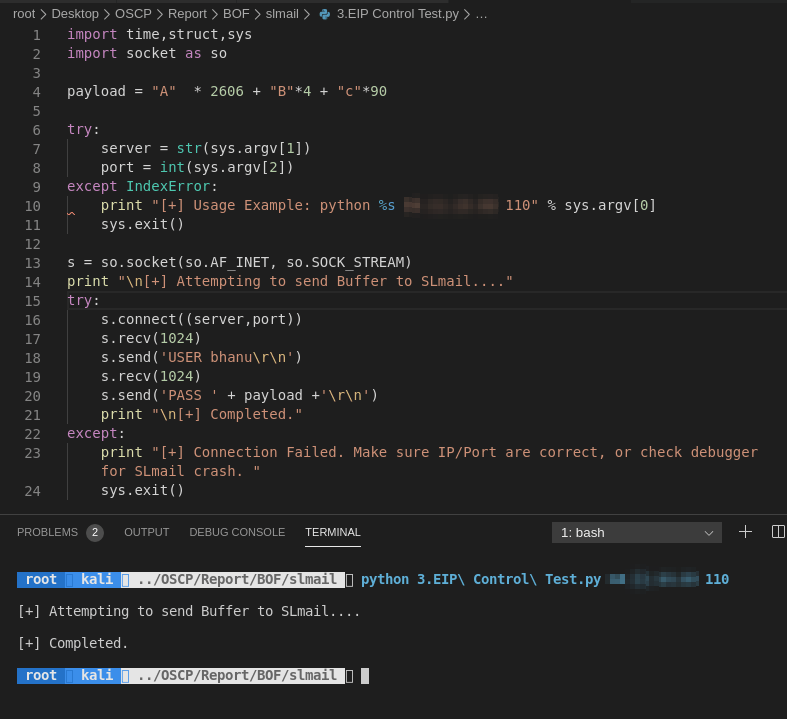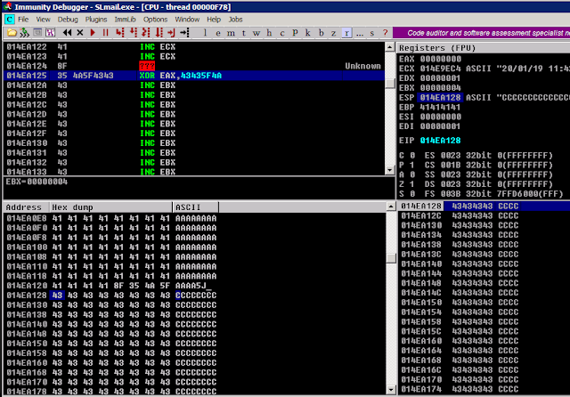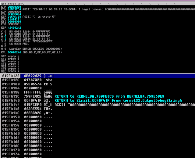 Below is the standalone script to verify the control over EIP address in SLmail by exploitiung Buffer Overflow. In which we need to add A*2606 + B*4. The control over EIP can be verified by checking if EIP is filled with ‘/x42’