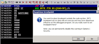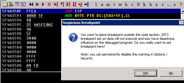 To setup a breakpoint at jmp esp → press F2 → Yes