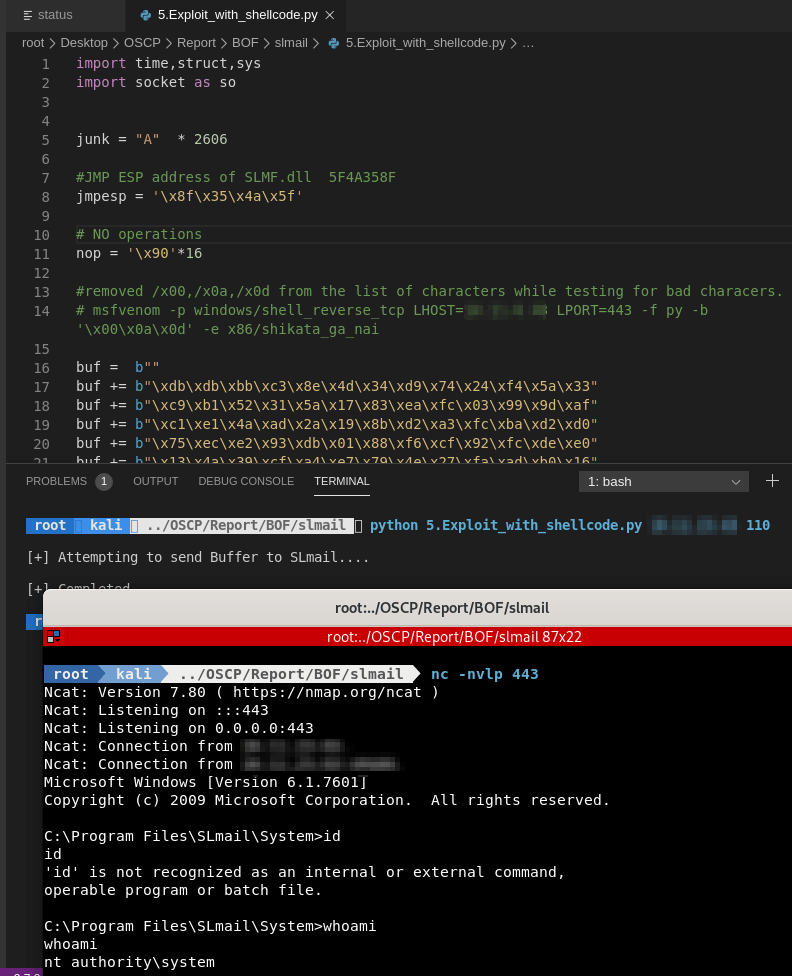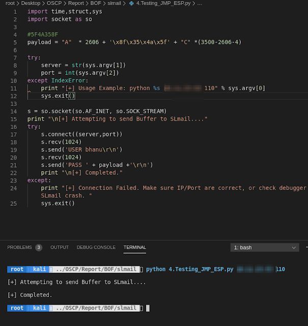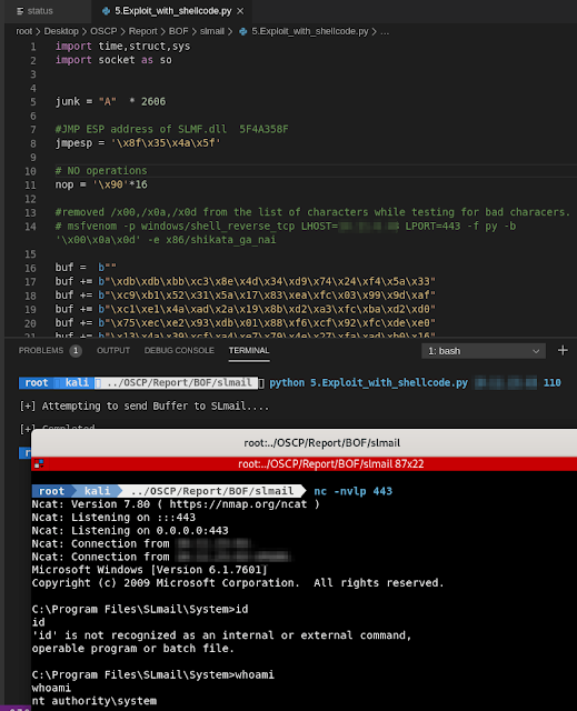 Final POC exploit for SLMail - Buffer Overflow is as below.