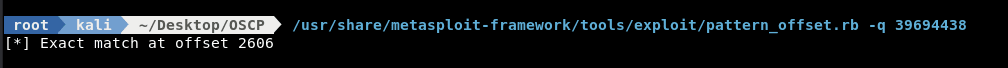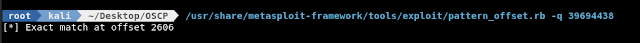 From the previous screenshot its clear that EIP Breaks at 39694438. So, this is the address we are looking for. we can use EIP 39694438 to find the offset address. it can be achieved by using pattern_offset.rb from metasploit framework as below.