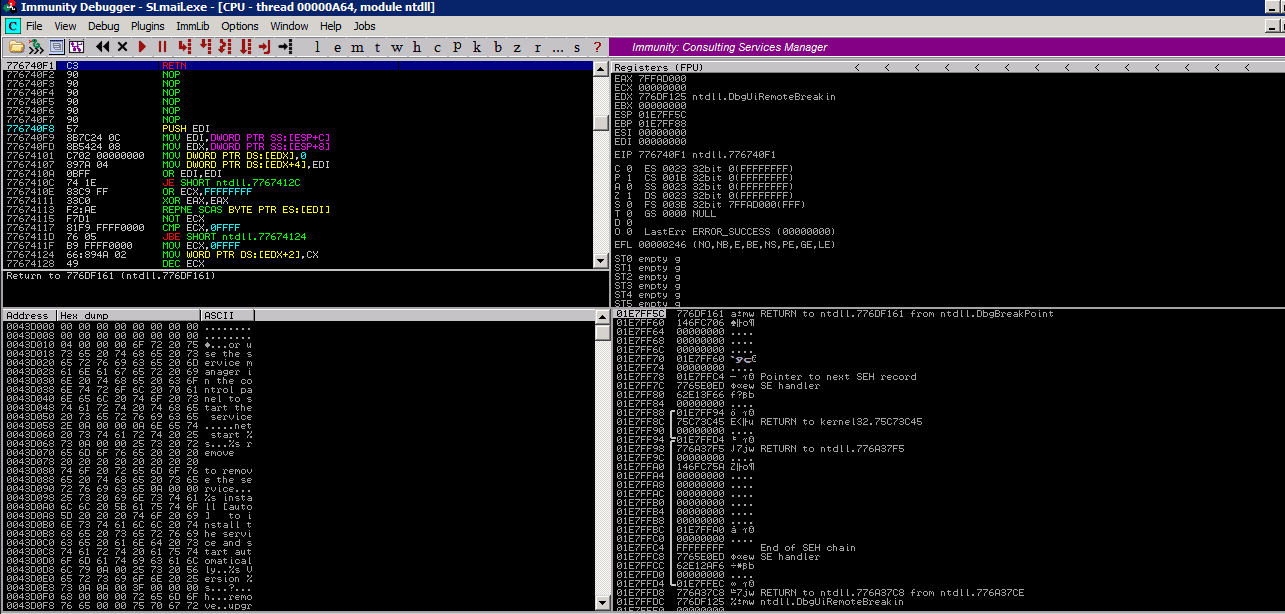 In this demo, I am using windows as Victim machine and Linux as attacker machine. Now install and start art SLmail on a windows machine and attach the process to Immunity Debugger by pressing “CTRL+F2” à select slmail.exe à ok à Click on “Run” to start the process.