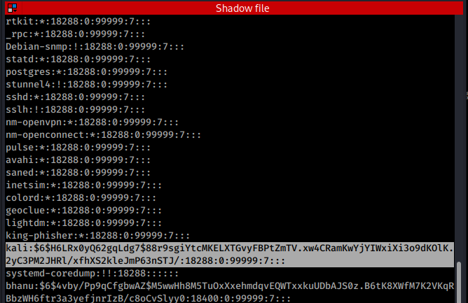 kali:$6$H6LRx0yQ62gqLdg7$88r9sgiYtcMKELXTGvyFBPtZmTV.xw4CRamKwYjYIWxiXi3o9dKOlK.2yC3PM2JHRl/xfhXS2kleJmP63nSTJ/:18288:0:99999:7:::