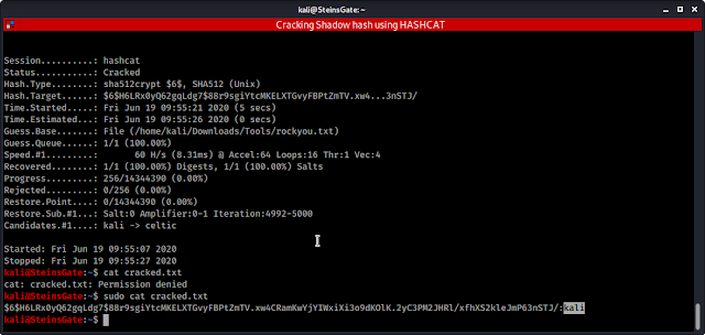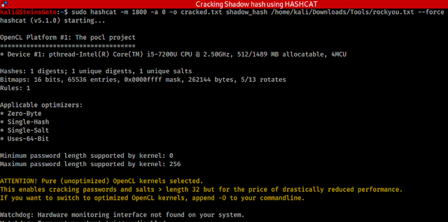 sudo hashcat -m 1800 -a 0 -o cracked.txt shadow_hash /home/kali/Downloads/Tools/rockyou.txt --force