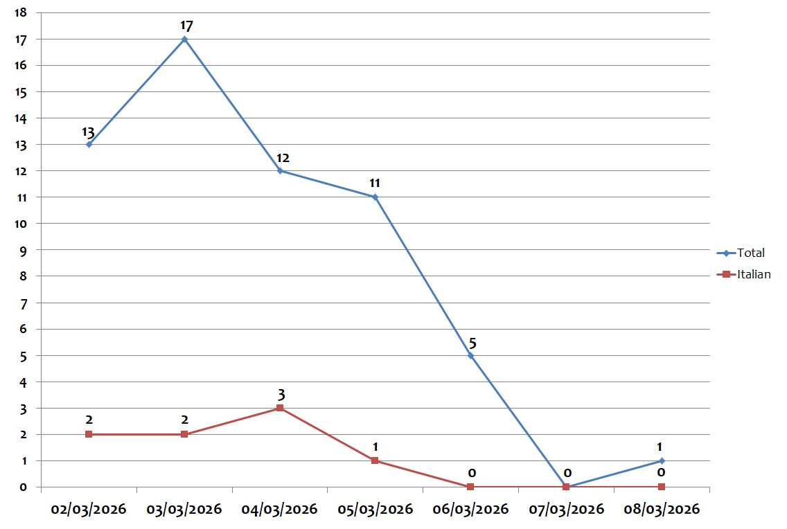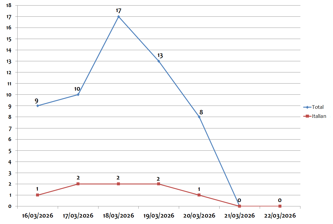 好的,我现在需要帮用户总结一篇关于意大利恶意垃圾邮件活动的文章,控制在100字以内。首先,我得通读整篇文章,抓住主要信息。 文章提到TG Soft CRAM在2026年3月2日至8日的报告,全球和意大利的恶意垃圾邮件活动都有所减少。主要恶意软件家族包括AgentTesla、FormBook、Remcos和VIPKeylogger。总共监测到59次活动,其中8次使用意大利语。峰值出现在3月3日全球和4日意大利。 接下来,我需要将这些信息浓缩成一句话,不超过100字。要确保包含时间范围、活动变化、恶意软件家族、监测数据和峰值情况。 可能会这样组织:TG Soft CRAM报告称,在2026年3月2日至8日期间,全球和意大利的恶意垃圾邮件活动有所减少。监测到59次活动,其中8次使用意大利语,峰值分别在3月3日和4日出现。 检查一下字数是否符合要求,并确保信息准确无误。 </think> TG Soft CRAM报告称,在2026年3月2日至8日期间,全球和意大利的恶意垃圾邮件活动有所减少。监测到59次活动,其中8次使用意大利语,峰值分别在3月3日和4日出现。...