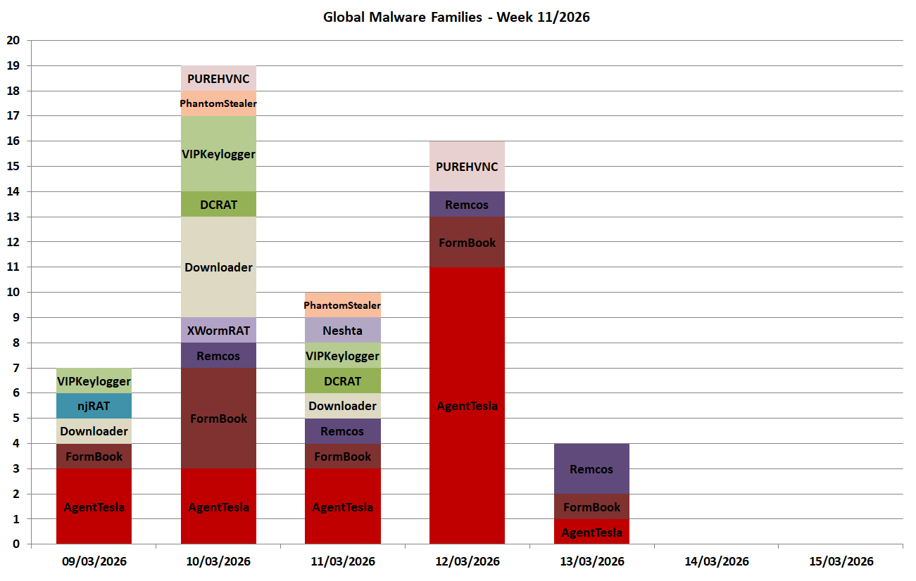 好的,我现在需要帮用户总结一篇关于意大利恶意软件活动的周报。用户要求用中文总结,控制在100字以内,不需要特定的开头。 首先,我需要快速浏览文章内容。文章主要讨论了从2026年3月23日到29日的意大利恶意软件活动情况。全球和意大利本地的活动数量都有所增加。主要涉及的恶意软件家族包括AgentTesla、PhantomStealer等。 接下来,我注意到文章提到了监测到67次活动,其中11次使用意大利语。峰值出现在25日,全球和意大利本地各达到21和6次活动。此外,恶意软件类型中脚本文件占主导,其次是可执行文件和MSIL文件。 然后,我需要将这些信息浓缩成100字以内的摘要。重点包括时间范围、活动数量增加、涉及的恶意软件家族、监测到的活动次数以及峰值情况。 最后,确保语言简洁明了,直接描述内容,不使用“这篇文章”等开头。 </think> TG Soft CRAM报告称,在2026年3月23日至29日期间,意大利及全球范围内的恶意软件活动有所增加。监测到67次活动,其中11次使用意大利语。峰值出现在25日,全球和意大利本地分别有21和6次活动。恶意软件家族包括AgentTesla、PhantomStealer等。...