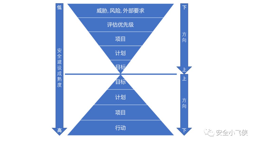二,从下而上的思路,此方法适用于中小型或者安全成熟度较低的企业。这类企业由于安全建设的不完善,通常比较难在短时间内找到明确的目标来指导实践的落地。这时,反向操作的效果可能会更好点,比如:先评估当前企业面临的真实威胁、风险和外部要求(如合规和政策需求,第三方合作需求),然后评估优先级,接着建立不同项目来解决问题,随后根据项目的成果来指定短中长期计划,最后利用这些计划和已知的数据来设定目标(即所谓的数据驱动安全),随着安全体系建设的逐步成熟便可以采用从上而下的思路来继续完善和持续改进。