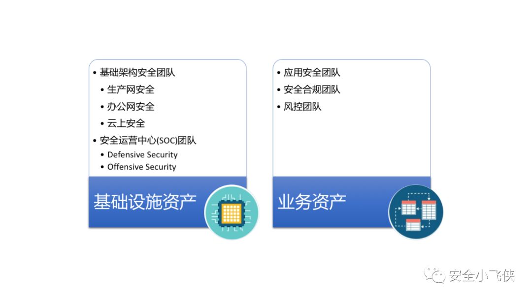 对于业务资产,则需要应用安全团队来保证业务程序、软件、系统和服务的安全开发以及业务数据在整个生命周期中的保护,安全合规团队来保证业务数据使用的合法与合规,风控团队来确保业务的连续性和风险的可控性等。