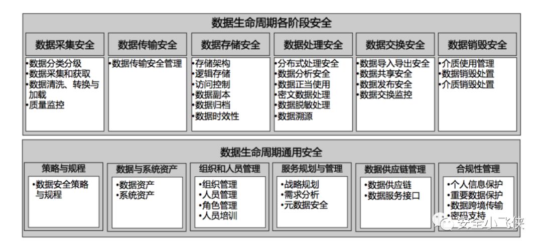 数据安全过程纬度:包括数据生命周期安全(数据的采集,传输,存储,处理,交换,销毁)和通用安全。