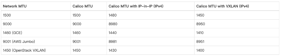 下表列举了,常见几种 MTU 配置下 calico 对应的网卡 mtu 的配置