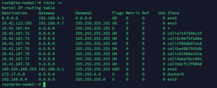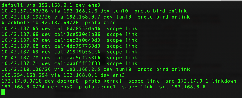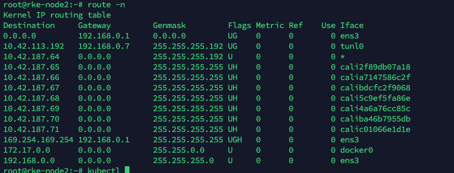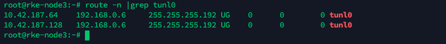 修改完成后对节点进行重启,等待恢复后查看主机路由,与 ipip 最大区别在于去往其他节点的路由,由 Tunnel0 走向网络网卡。