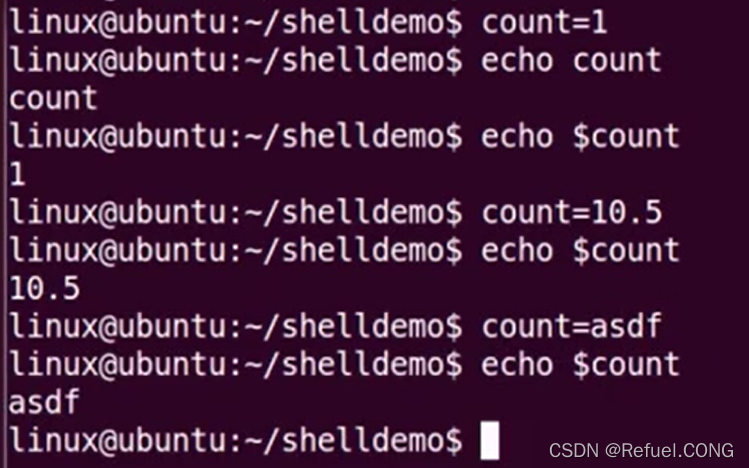 shell允许用户建立变量存储数据,但不支持数据类型(整型,字符,浮点型),将任何赋给变量的值都解释为一串字符Variable = value