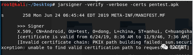 jarsigner -verify -verbose -certs pentest.apk到此为止,就完成了签名过程,此apk就可以在Android中使用了