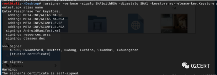 jarsigner -verbose -sigalg SHA1withRSA -digestalg SHA1 -keystore my-release-key.Keystore pentest.apk alias_name第三步:然后使用JARsigner验证签名