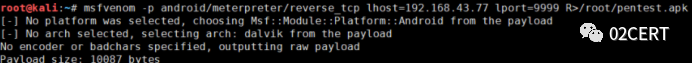 第二步:生成payload(msfvenom命令中默认没有apk这种格式的文件。此处使用R来替代-f和-o)