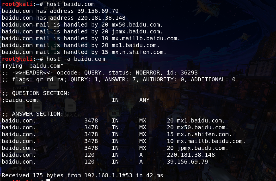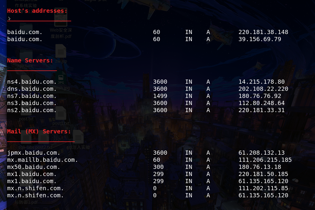 该程序将收集的DNS信息分为:主机ip地址、该域的DNS服务器、该域的MX记录